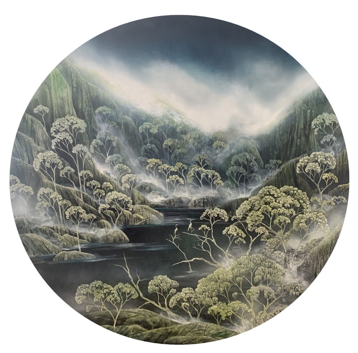 ink, acrylic, soldering iron on board 100 cm diameter