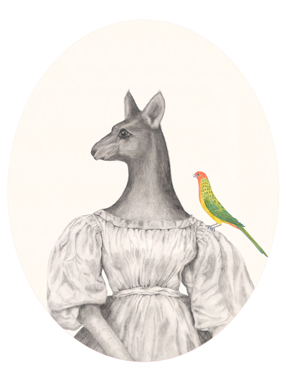 2017 Ink, watercolour & pencil on Arches paper 56 x 46 cm / 78 x 67 cm framed This hybrid portrait is inspired by the painting ‘Kangaroos’ Attributed to John Lewin, unsigned, 1800-1806 From the Royal College of Surgeons, London. The Harvard Wedding dress, is from the collection: Museum of Applied Arts & Sciences, Sydney.