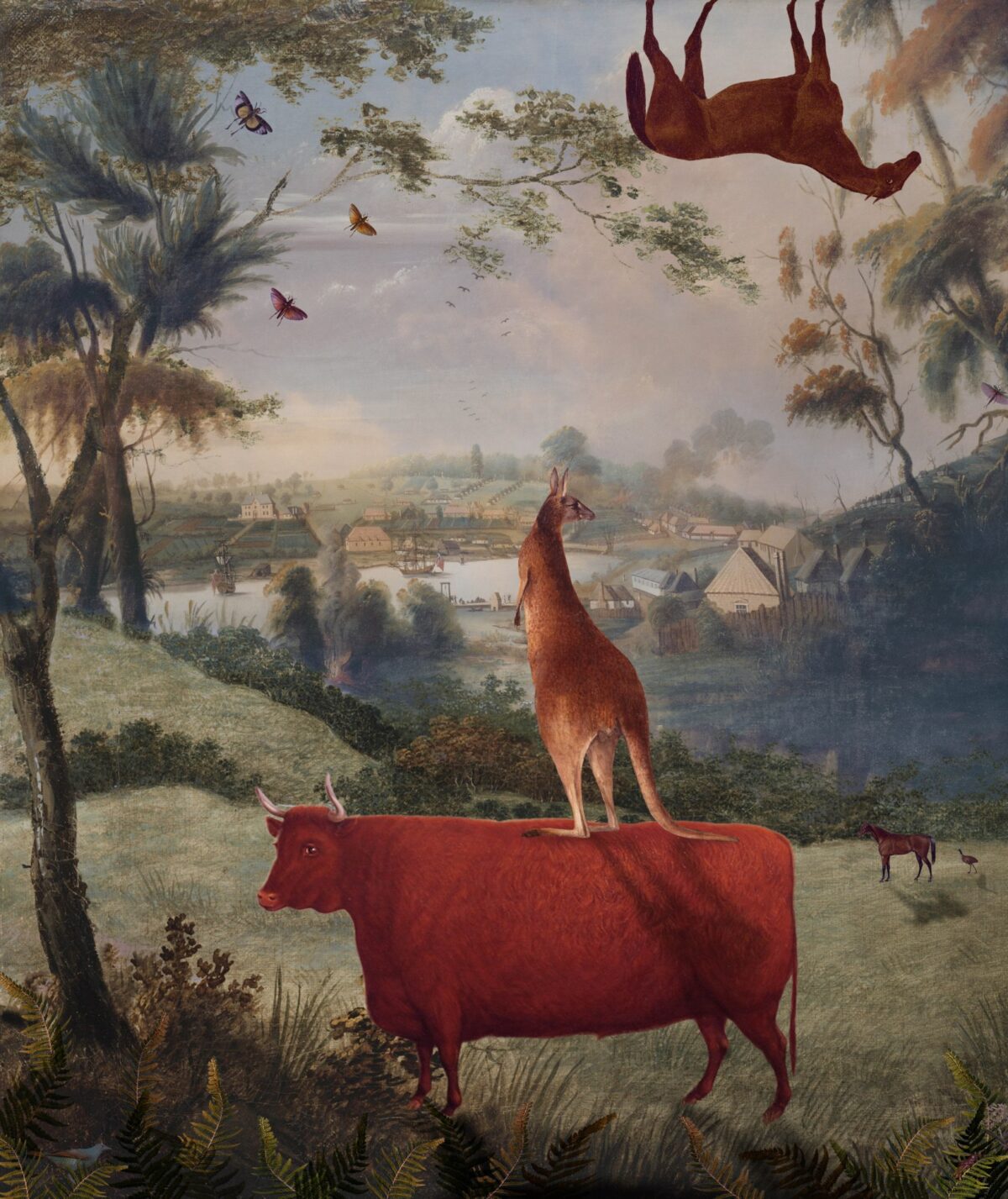 A multilayered photomontage, is composed of reimagined imagery manipulated and gathered from historical archives and contemporary sources. ‘Eurotipodes’, is a term I created to express my feelings about the Eurocentric interpretation of the world, the notion that the Northern Hemisphere is the ‘right’ way up and we hang upside down giddily suspended in our opposite ‘Antipodes’. The interaction and placement of creatures invite the viewer to reconsider assumptions: about what counts as “normal” orientation, perspective, and which histories are foregrounded or marginalized. This work questions colonial history, representation, mythmaking, ecology, extinction, introduced species and ecological changes. I use flora and fauna, emblematic, native and introduced to reflect environmental concerns: how landscapes have been changed, species lost, or ecological balance disrupted. The orientation of the iconic horse, upside down, inverted, is not just metaphorical, but a device to destabilize comfortable narratives. References: A direct north general view of Sydney Cove ... 1794 attributed to Thomas Watling 'Kangaroos in a Landscape’ John Lewin 1819 Henry Stone and his Durham ox by Thomas Flintoff 1887