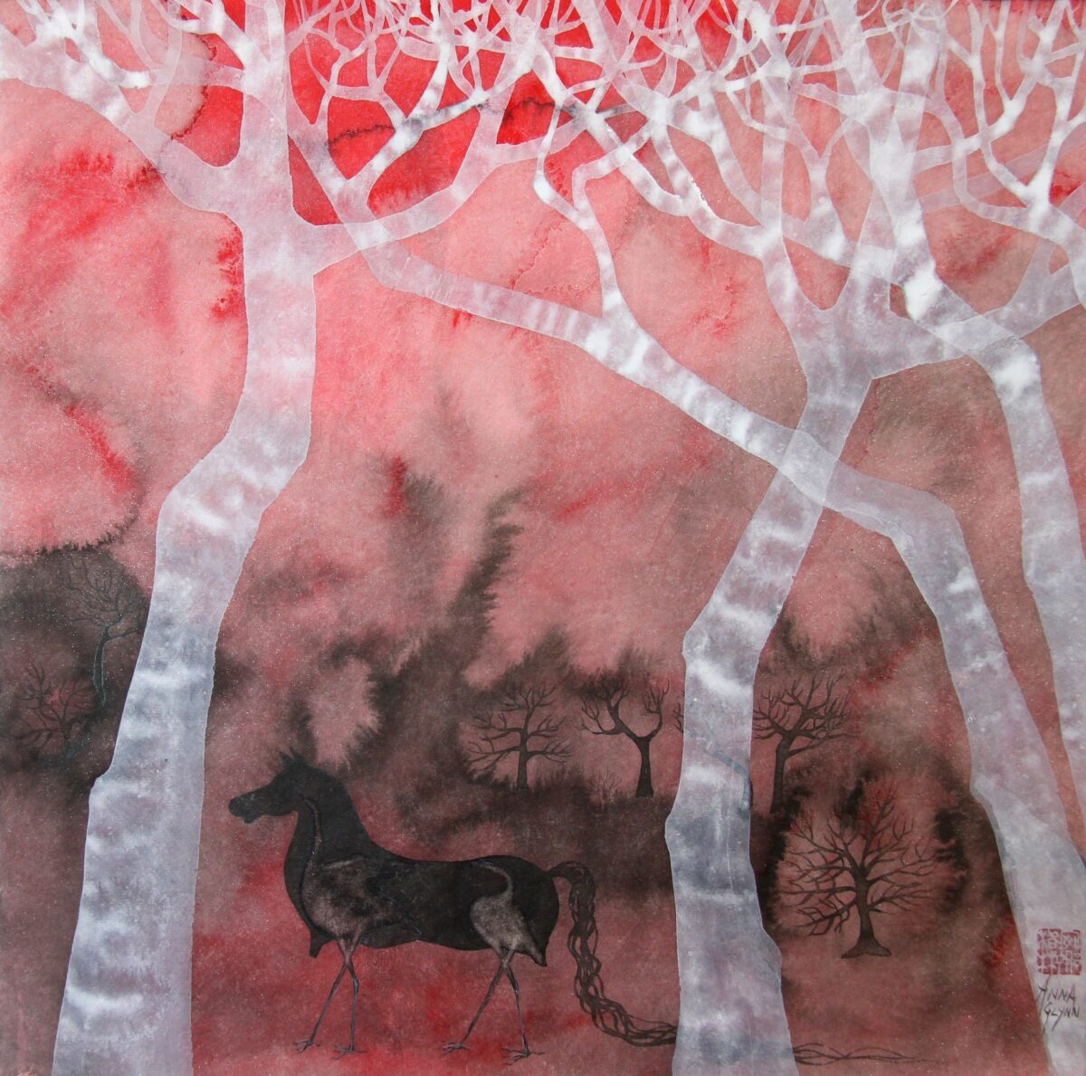 A diaphanous forest frames a horse containing two bird creatures, travellers together…